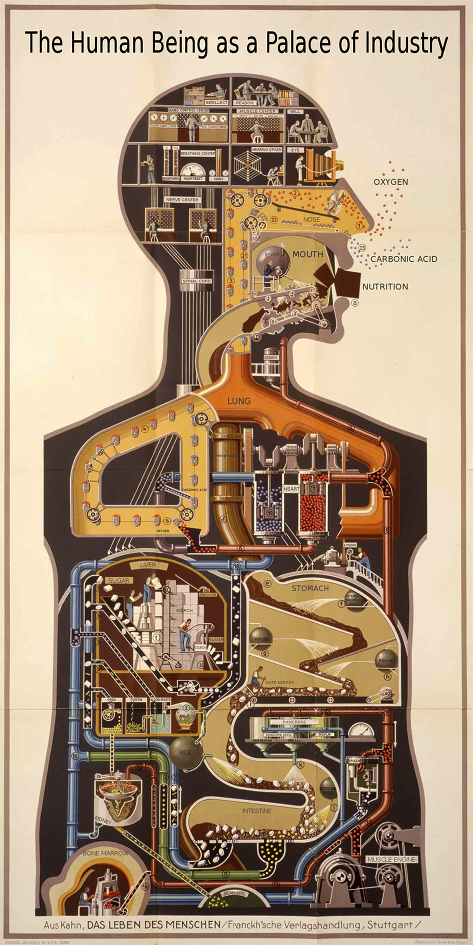 Der Mensch als Industriepalast or Man as Industrial Palace is a 1927 lithograph, designed by Fritz Kahn. Dr. Khan is a German physician who created a unique visual analogy between anatomy and machinery. This vintage infographic exhibit the human body’s digestive and respiratory system as a chemical manufacturing facility. Inspired by Khan’s work, someone produce an animated version of this.