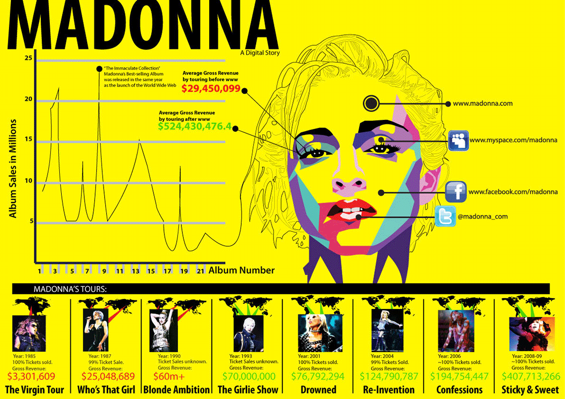 Legendary pop singer Madonna, in her three-decade long career, has acquired an impressive series of awards, selling millions of physical copy of her music in CDs and vinyl. Today’s technology paved the way to the growth of digital music, which drastically affect the sales of physical records. Like many artist today, Madonna has learned to embrace this new era, knowing its positive effects on her concert tours and album promotions. Music in the digital age enables both established and independent artists to make their singles and albums cheaper to produce and free to promote. Here’s an infographic, made by a design student, to illustrate the effect of the internet and digital music on Madonna’s illustrious career. See also Michael Jackson: Life and Work.