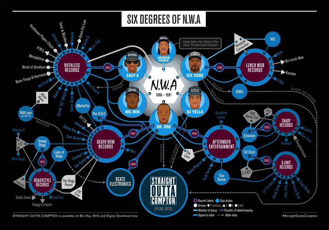 NWA is regarded as the pioneer of gangsta rap, a subgenre of hip hop music. Having grown up around gang violence and drug trades, Dr. Dre, Eazy-E, Ice Cube, Arabian Prince, MC Ren and DJ Yella rap about America’s nasty realities and give no apologies for the strong social commentary in their lyrics. The movie Straight Outta Compton show the rise and setbacks of NWA. The mind map below gives an overview of NWA’s connection to new rappers like Snoop Dogg, Tupac, Eminem and 50-Cent. See also Tupac Shakur: Life by the Numbers and Eminem: Old School vs New School