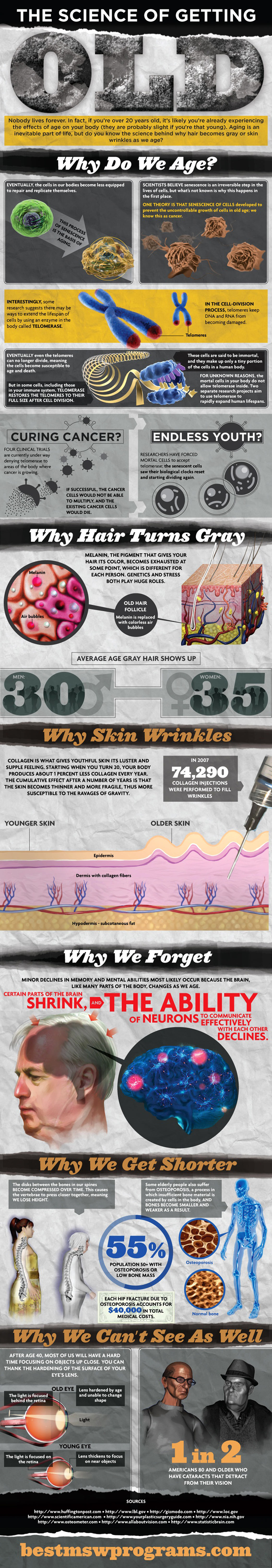 As we age, our body enter a biological aging process in which our system naturally deteriorate and we become more vulnerable from everyday wear and tear. At old age, many important physical and mental functions stared to fail. This graphic answer the commonly ask questions about human aging; why do we age, why our hair turns gray, why our skin wrinkles, why we get shorter, why we go blind and why we easily forgot as we age. See also Our Aging Population.