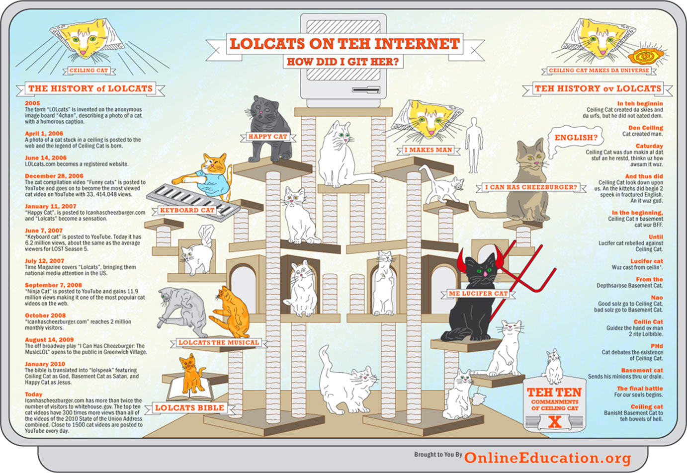 Lolcats is an offbeat internet phenomenon and remained interesting and still amusing. Don’t worry if the curiosity has been killing you all of these years. Here’s an amusing graphical history of the Keyboard Cat, Happy Cat and all other weird feline celebrities. See also Guide To Cat Physics.