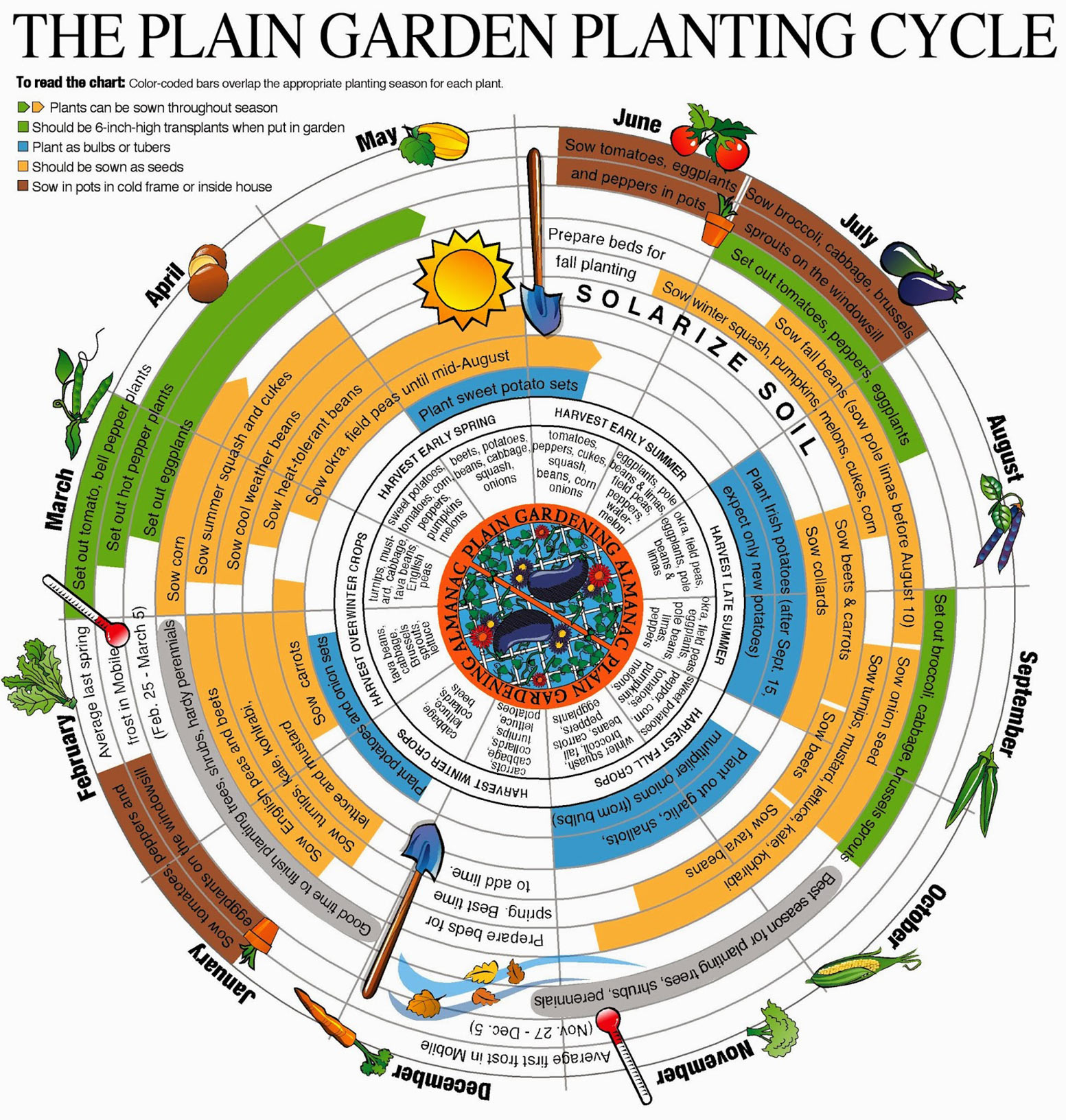 Part of the excitement of garden planning is selecting which variety of seeds you want to cultivate. Picking best vegetables to grow in the ideal season will determine the outcome of your gardening experience. The Plain Garden Planting Cycle serves as a reliable gardening guide when you need it. This wonder wheel will show you the best time for planting practically all of your favorite veggies. See also the table guide for Growing Fruits in Your Garden All Year Round and the Herb Growing Cheat Sheet.