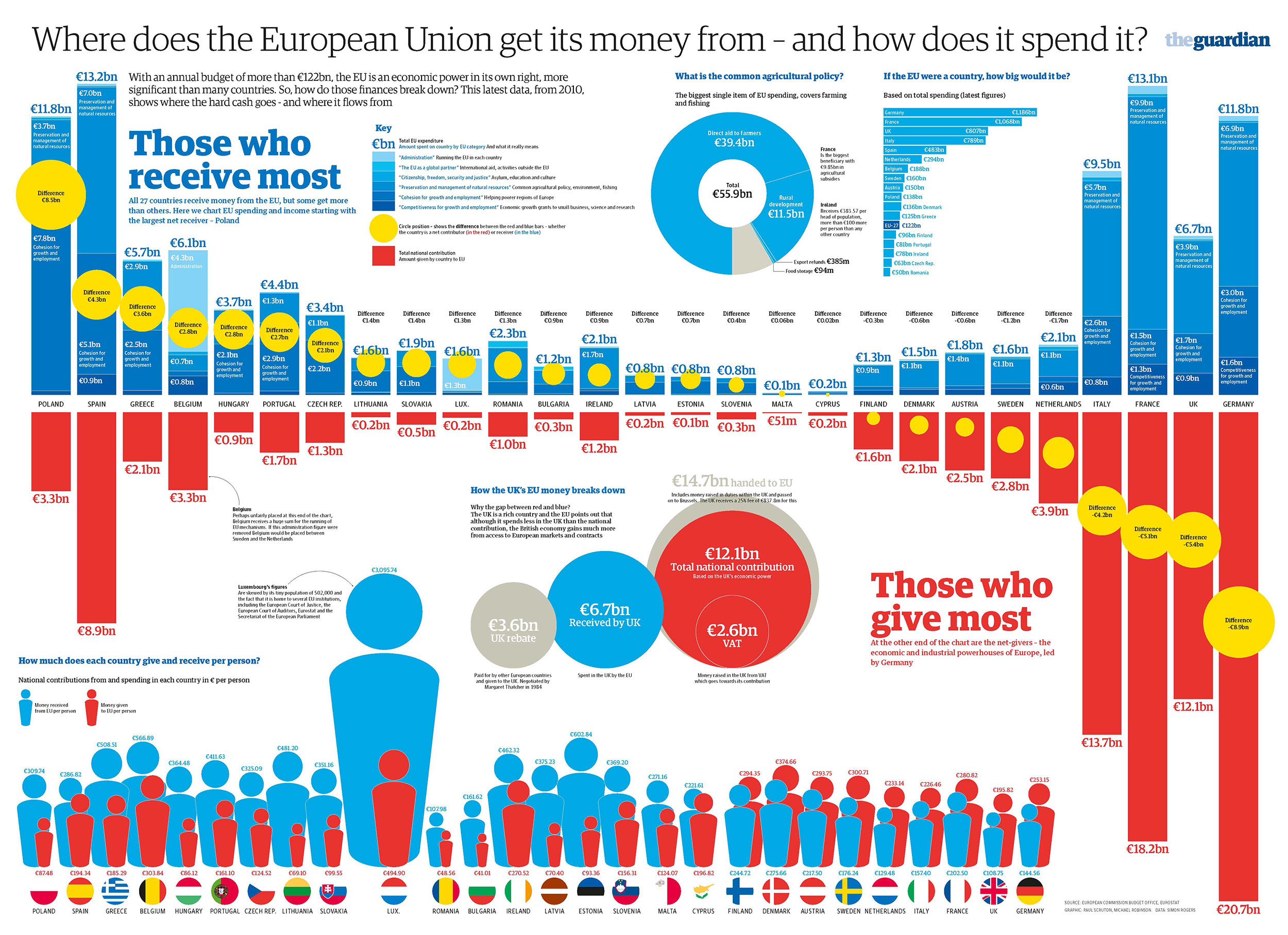 The financing and expenditures of the European Union is a complex subject. Unlike national states, EU doesn’t need to spend money on social security, pensions or defense. The following informative graph track EU’s source of income, including the contributions from member countries, and how its budget are spent on various projects and beneficiaries.